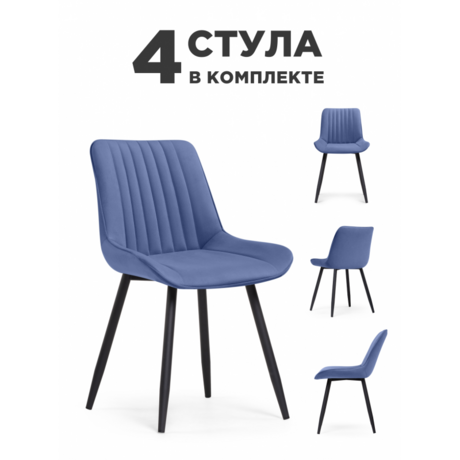 ВейвКомплект из 4 мягких стульев, велюр синий, металлический черный каркас, для кухни и гостиной